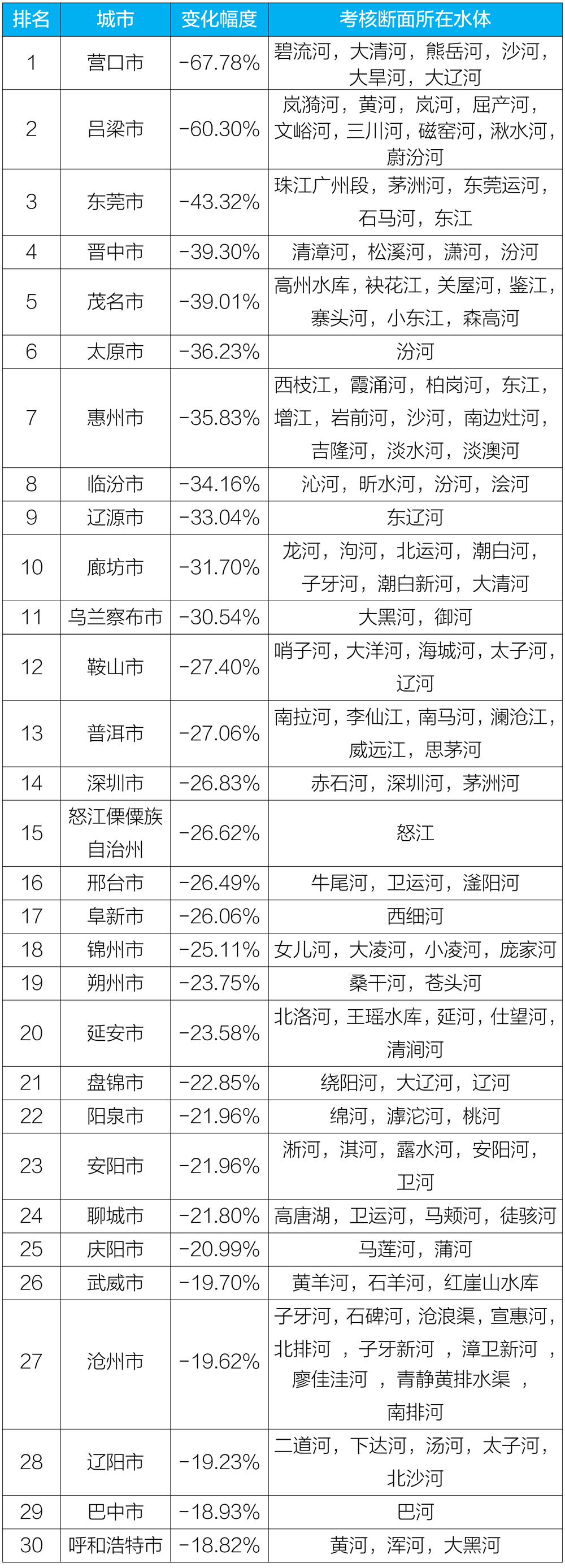附表5:2020年1-12月國家地表水考核斷面水環(huán)境質(zhì)量變化情況排名前30位城市及所在水體