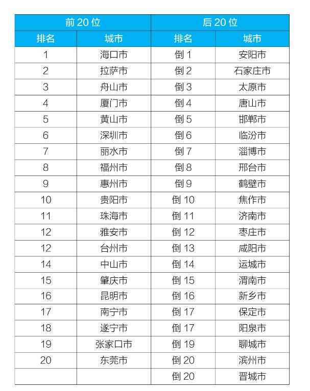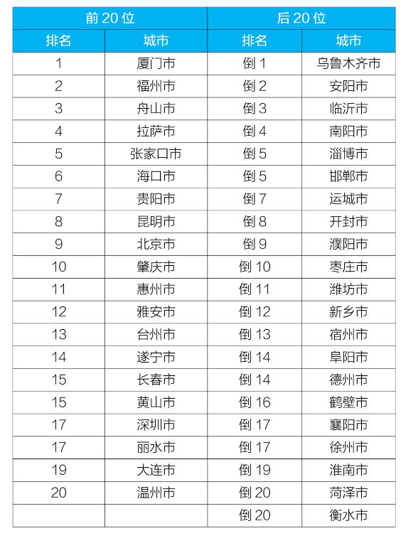 12月,168個(gè)重點(diǎn)城市中,烏魯木齊、安陽和臨沂市等城市空氣質(zhì)量相對較差(從倒數(shù)第1名至并列倒數(shù)第20名);廈門、福州和舟山市等城市空氣質(zhì)量相對較好(從第1名至第20名),見附表7。