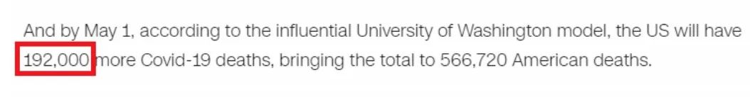 據(jù)美國有線電視新聞網(wǎng)(CNN)當(dāng)?shù)貢r間15日報道,根據(jù)華盛頓大學(xué)健康指標(biāo)和評估研究所的新冠病毒模型預(yù)測,約22%的美國人口已經(jīng)感染新冠病毒,外加受變異新冠病毒傳播影響,美國將在5月1日之前新增19.2萬例新冠肺炎死亡病例,屆時美國新冠肺炎死亡病例總數(shù)預(yù)計將達(dá)到566720例。