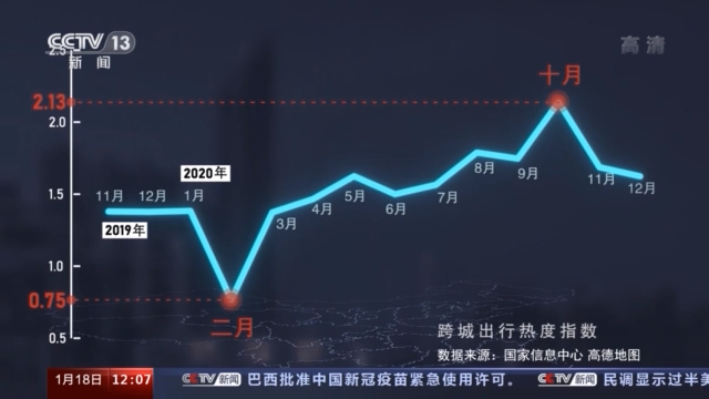 國家信息中心根據(jù)用戶出行的位置變化信息,測算出了這張反映人們跨城出行熱度的曲線,經(jīng)歷了2月的“低谷”,一路上揚(yáng),在10月,迎來最高點(diǎn)。