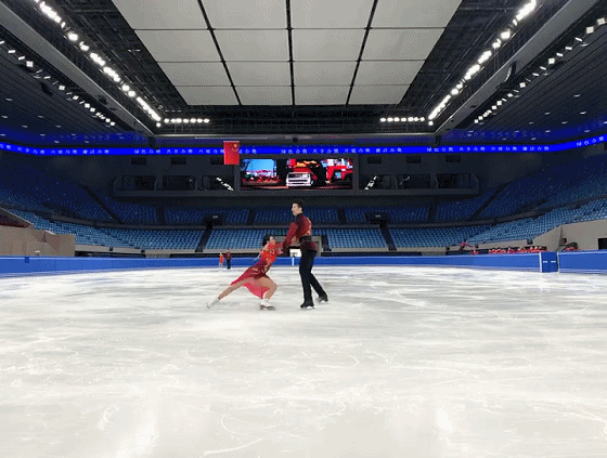 △左邊是花樣滑冰雙人滑選手隋文靜、韓聰?shù)谋荣惙,兩位選手在“2020年國(guó)際滑聯(lián)花樣滑冰四大洲錦標(biāo)賽”中奪冠。(總臺(tái)央視記者范一鳴拍攝)