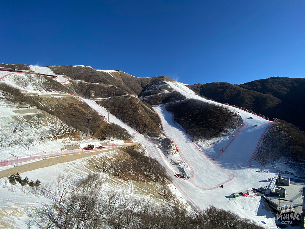 △國(guó)家高山滑雪中心的雪道系統(tǒng)共設(shè)7條雪道,3條用于競(jìng)賽,4條作為訓(xùn)練,總長(zhǎng)9.2公里,其中滑降賽道落差近900米。(總臺(tái)央視記者楊立峰拍攝)