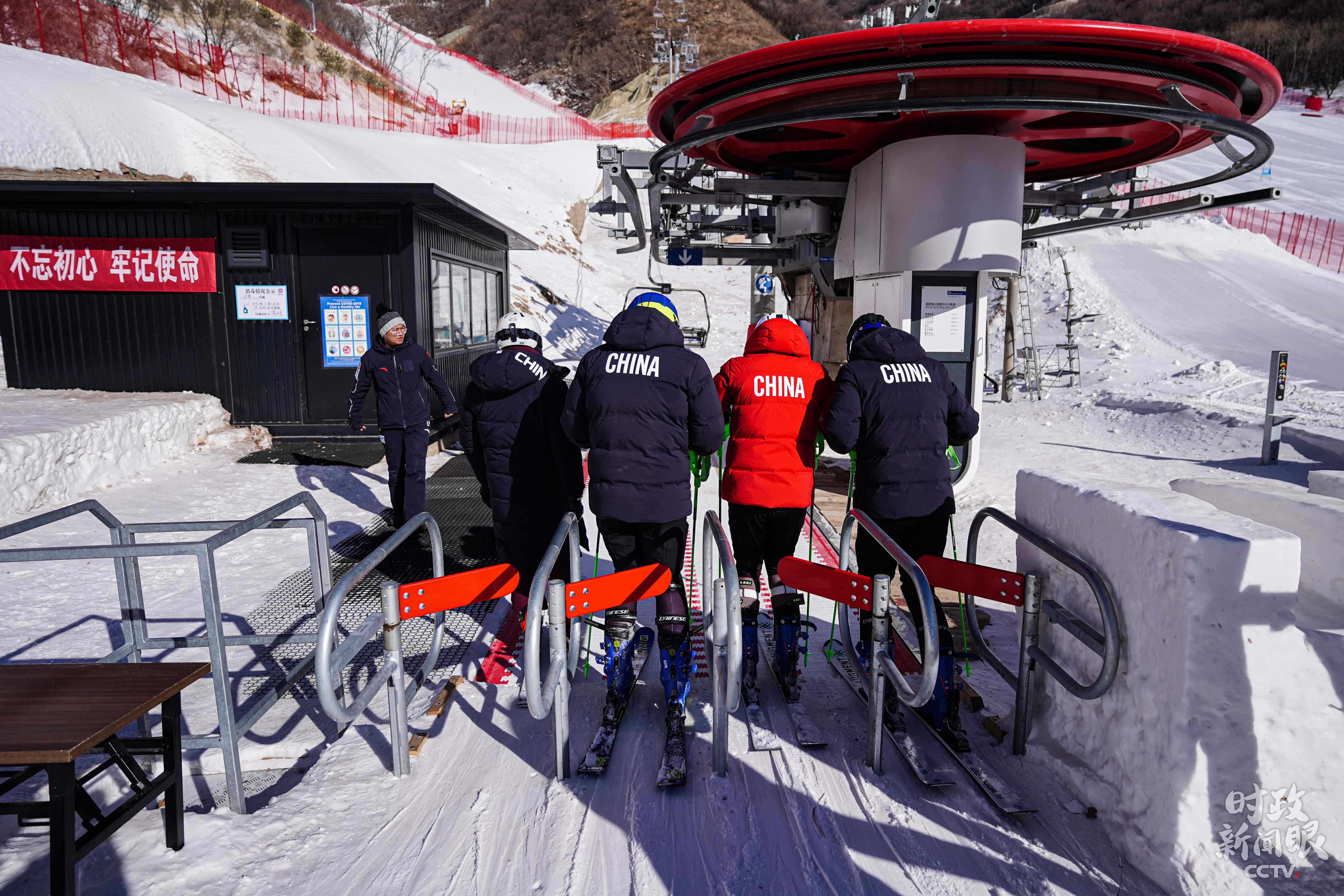△國(guó)家高山滑雪隊(duì)員準(zhǔn)備搭乘纜車(chē)上訓(xùn)練賽道。(總臺(tái)國(guó)廣記者李晉拍攝)
