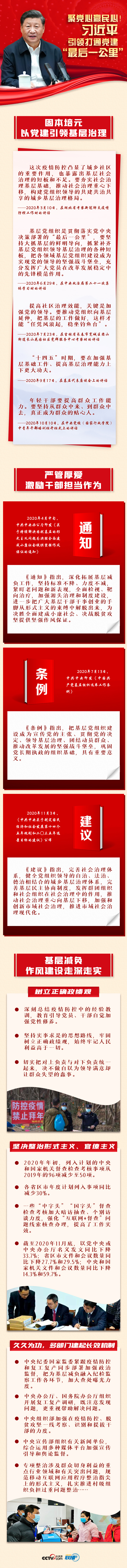 2020年,習(xí)近平總書記在多個重要會議和考察活動中強調(diào)要堅持大抓基層的鮮明導(dǎo)向,把各領(lǐng)域基層黨組織建設(shè)成為實現(xiàn)黨的領(lǐng)導(dǎo)的堅強戰(zhàn)斗堡壘。圍繞一線“筑壘工程”,黨中央出臺哪些措施不斷增強基層凝聚力?基層減負(fù)效果如何?央視網(wǎng)《聯(lián)播+》欄目特推出長圖,與您一起來學(xué)習(xí)。