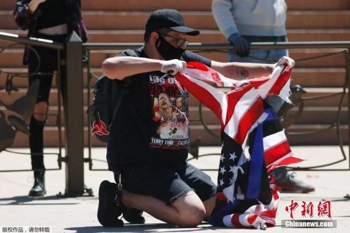 資料圖:當(dāng)?shù)貢r(shí)間2020年5月29日,美國(guó)丹佛,示威者撕毀了一面美國(guó)國(guó)旗。