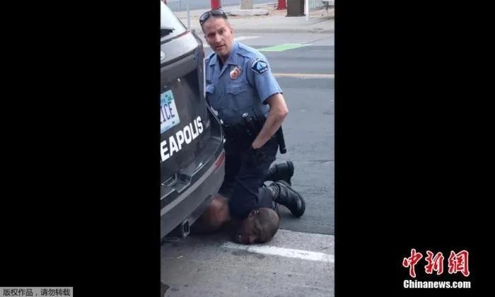 當(dāng)?shù)貢r(shí)間5月25日,美國(guó)明尼蘇達(dá)州明尼阿波利斯市一名警察在逮捕非裔男子喬治·弗洛伊德時(shí),將其按在地上,用膝蓋頂住脖子。(視頻截圖)