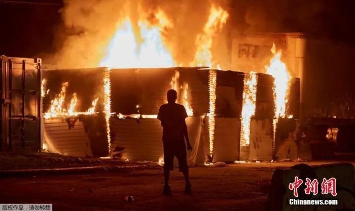 資料圖:弗洛伊德之死引發(fā)了大規(guī)?棺h,有暴徒趁機(jī)縱火和搶劫。圖為抗議者在明尼阿波利斯市第三警察局附近燒毀一處建筑設(shè)施。