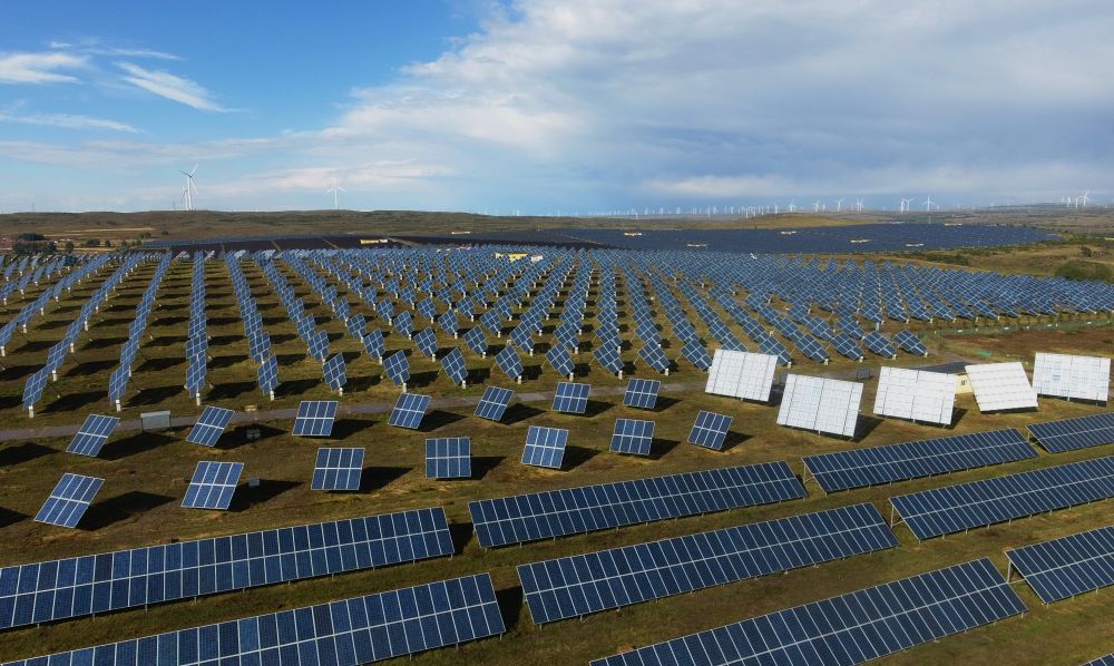 張家口市張北縣大河鄉(xiāng)國家風(fēng)光儲輸示范基地的光伏發(fā)電站和風(fēng)電場遙相呼應(yīng)(9月15日無人機(jī)拍攝)。新華社記者楊世堯攝
