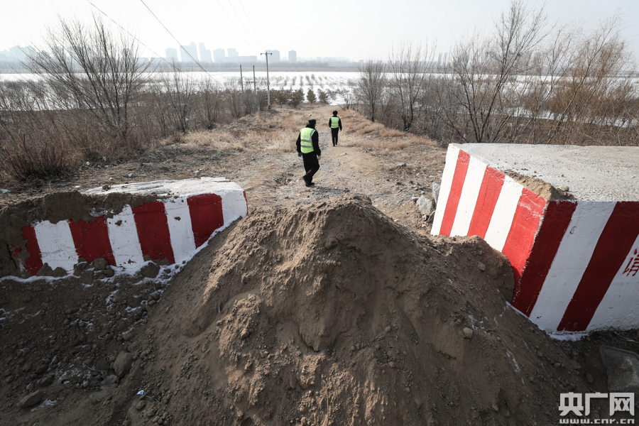 巡防人員正在河堤上執(zhí)勤,河對(duì)岸就是河北省廊坊市(央廣網(wǎng)記者 韓靖 攝)