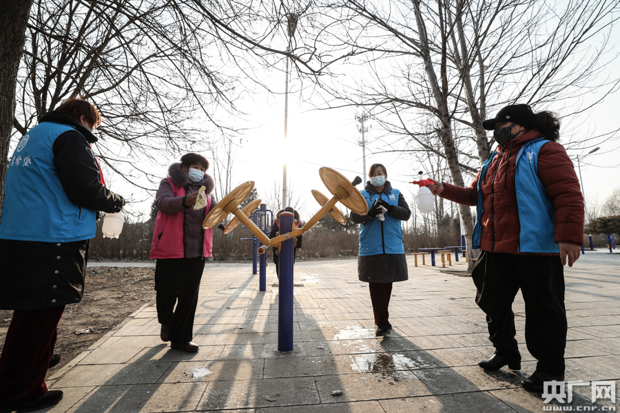 隊(duì)員們正在為健身器材消毒(央廣網(wǎng)記者 韓靖 攝)