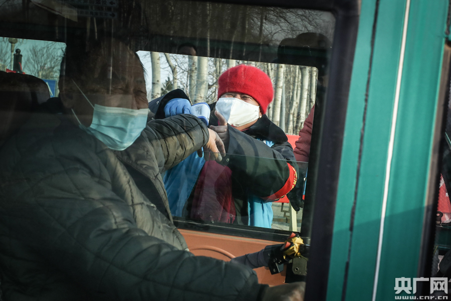 執(zhí)勤人員正在為進(jìn)村人員測(cè)量體溫(央廣網(wǎng)記者 韓靖 攝)
