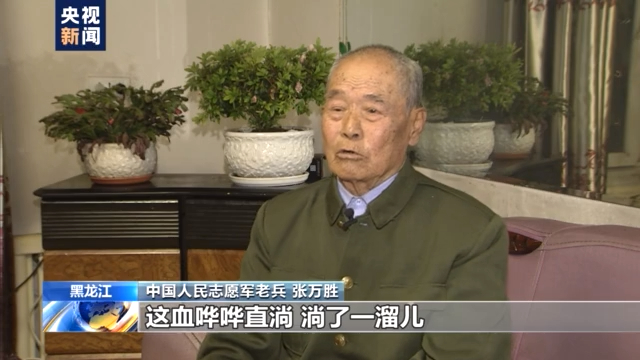 中國(guó)人民志愿軍老兵 張萬(wàn)勝:(子彈)打我這兒,沒打著,打偏了就這樣,把鋼盔一下打掉了。我摸摸我的頭骨,這血嘩嘩直淌,淌了一溜兒。