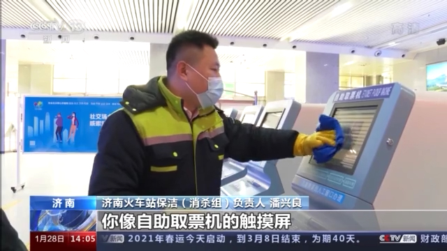 濟南火車站保潔(消殺組)負責人 潘興良:你像自助取票機的觸摸屏、電梯的扶手帶,包括水龍頭開關,旅客使用比較頻繁,所以由原來的兩小時一次消毒改為現(xiàn)在的一小時一次消毒。