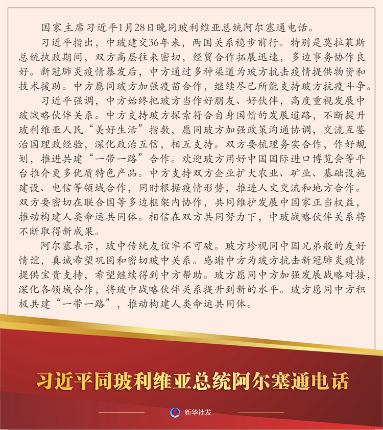 阿爾塞表示,玻中傳統(tǒng)友誼牢不可破。玻方珍視同中國兄弟般的友好情誼,真誠希望鞏固和密切玻中關系。感謝中方為玻方抗擊新冠肺炎疫情提供寶貴支持,希望繼續(xù)得到中方幫助。玻方愿同中方加強發(fā)展戰(zhàn)略對接,深化各領域合作,將玻中戰(zhàn)略伙伴關系提升到新的水平。玻方愿同中方積極共建“一帶一路”,推動構建人類命運共同體。