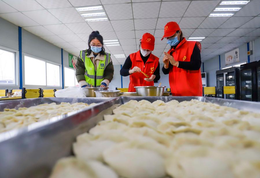 1月31日,河北唐山遵化市志愿者在京秦高速遵秦段東舊寨施工路段項目部駐地與工人一起包餃子。新華社發(fā)(劉滿倉 攝)