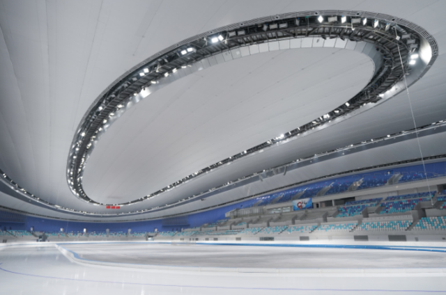 新建的國家速滑館,是北京主賽區(qū)標(biāo)志性場館,也是唯一新建的冰上競賽場館,被形象地稱為“冰絲帶”。國家速滑館利用2008年奧運會曲棍球和射箭的臨時場地進行建設(shè),擁有亞洲最大的全冰面設(shè)計,冰面面積達1.2萬平方米。