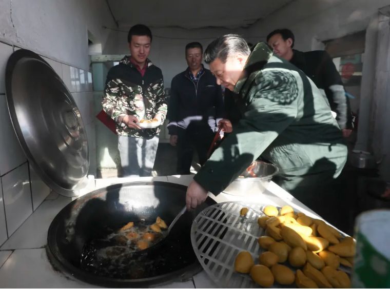 ↑2017年1月24日,習(xí)近平在河北張家口市張北縣小二臺鎮(zhèn)德勝村村民徐學(xué)海家炸年糕。