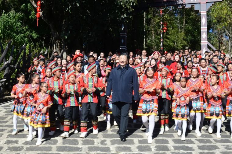 ↑2020年1月19日,云南騰沖市清水鄉(xiāng)三家村中寨司莫拉佤族村的鄉(xiāng)親們唱著《阿佤人民唱新歌》,簇?fù)碇?xí)近平走出村口。