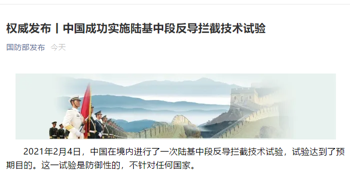 中國(guó)臺(tái)灣網(wǎng)2月4日訊 據(jù)“國(guó)防部發(fā)布”消息,2021年2月4日,中國(guó)在境內(nèi)進(jìn)行了一次陸基中段反導(dǎo)攔截技術(shù)試驗(yàn),試驗(yàn)達(dá)到了預(yù)期目的。這一試驗(yàn)是防御性的,不針對(duì)任何國(guó)家。(完)