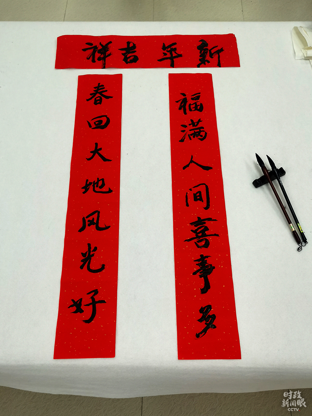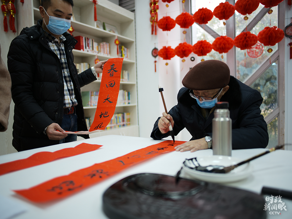 △84歲的社區(qū)居民戴世倫老先生,曾在貴州廣播電視大學(xué)任教。這是他寫的春聯(lián)。(總臺央視記者彭漢明、姚瑤拍攝)