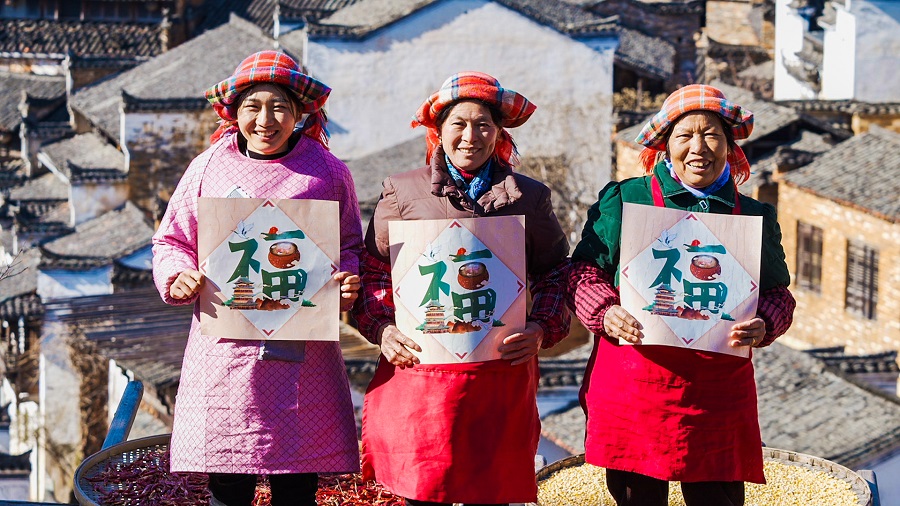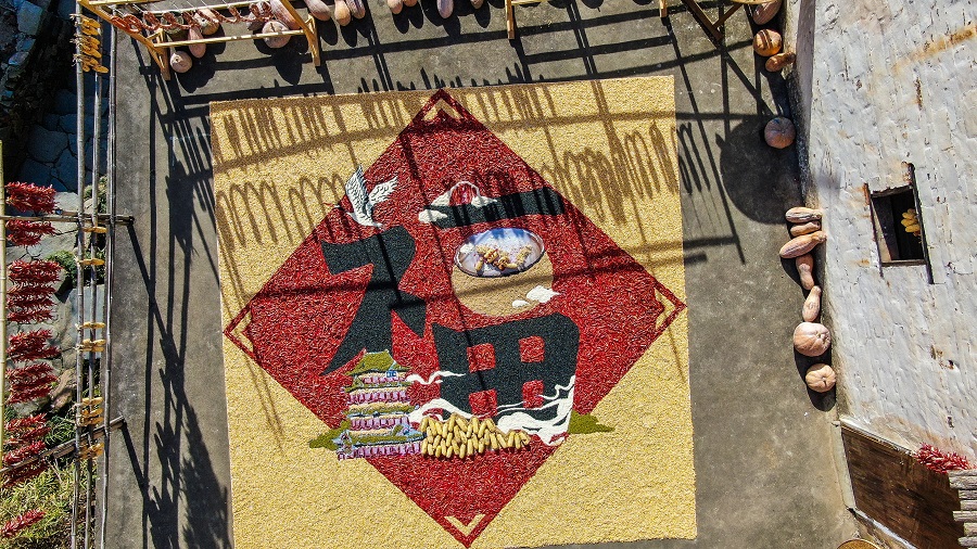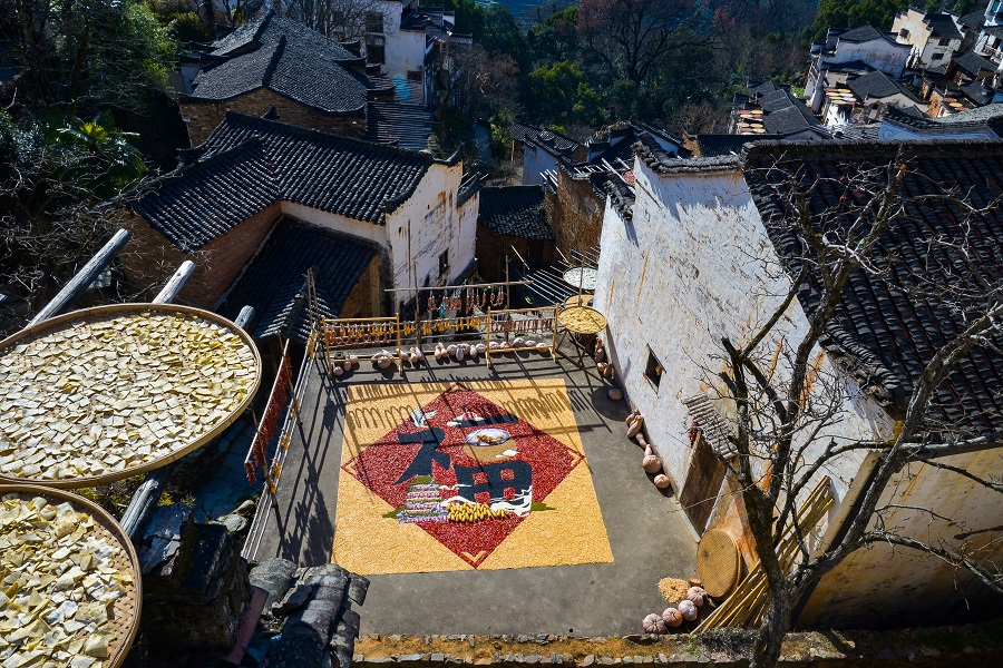 春節(jié)臨近,江西省婺源縣篁嶺村,年味越來越濃。近日,曬秋大媽們用辣椒、玉米等農(nóng)作物曬出“!弊衷煨,為游客送上新年的祝福。這個(gè)“!弊诌融入了瓦罐湯、滕王閣等江西元素,十分富有創(chuàng)意。(王中慶)