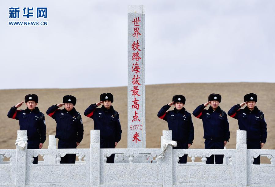 2月4日,沱沱河站派出所巡線(xiàn)民警在“世界鐵路海拔最高點(diǎn)”標(biāo)志碑前合影。