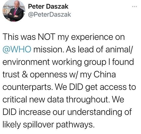 世界衛(wèi)生組織病原體顧問、美國(guó)非營(yíng)利組織生態(tài)健康聯(lián)盟(EcoHealth Alliance)主席彼得·達(dá)扎克(Peter Daszak)在推特上表示:“這不是我在世界衛(wèi)生組織的任務(wù)中得到的經(jīng)驗(yàn),作為動(dòng)物和環(huán)境工作組的負(fù)責(zé)人,我感到中國(guó)同行們坦率并值得信任。我們(在調(diào)查中)得到了重要的新數(shù)據(jù),我們也了解了更多關(guān)于病毒傳播途徑的信息!