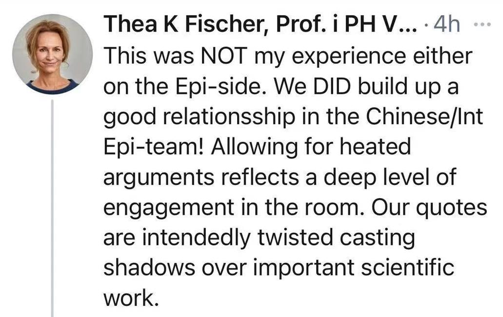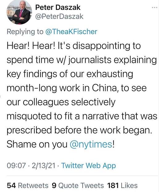 世界衛(wèi)生組織麻疹、風(fēng)疹、流感和小兒麻痹癥參考實(shí)驗(yàn)室負(fù)責(zé)人、公共衛(wèi)生專家西婭·菲舍爾(Thea K Fischer)也在推特上發(fā)帖表示《紐約時(shí)報(bào)》的報(bào)道嚴(yán)重扭曲了她所說的話:“這也不是我在流行病學(xué)團(tuán)隊(duì)得到的經(jīng)驗(yàn)。中國(guó)方面和國(guó)際流行病學(xué)團(tuán)隊(duì)建立了良好的關(guān)系,(我們)進(jìn)行的熱烈討論也反應(yīng)了(中國(guó)方面的)高度參與。我們說的話被嚴(yán)重扭曲,這為重要的科學(xué)工作帶來(lái)了陰影!