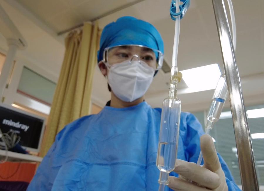 ↑2月11日,沈陽醫(yī)學(xué)院附屬中心醫(yī)院急診科護(hù)士邊春雨為患者檢查輸液情況。新華社記者 張逸飛攝