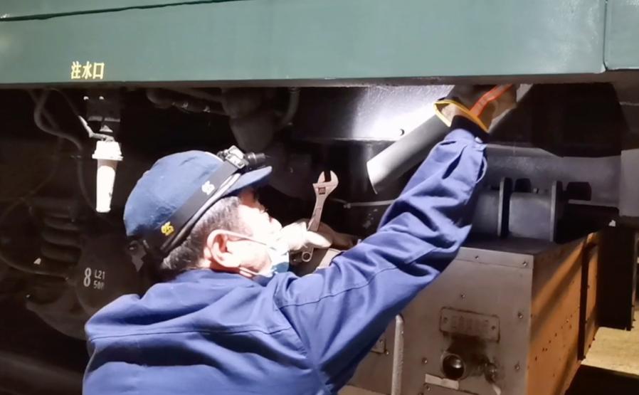爬上洗手臺查看給水管道、擰緊儀表閥、插管、拔管,周而復(fù)始,陳志杰在為列車的給水系統(tǒng)做出發(fā)前最后的檢修。