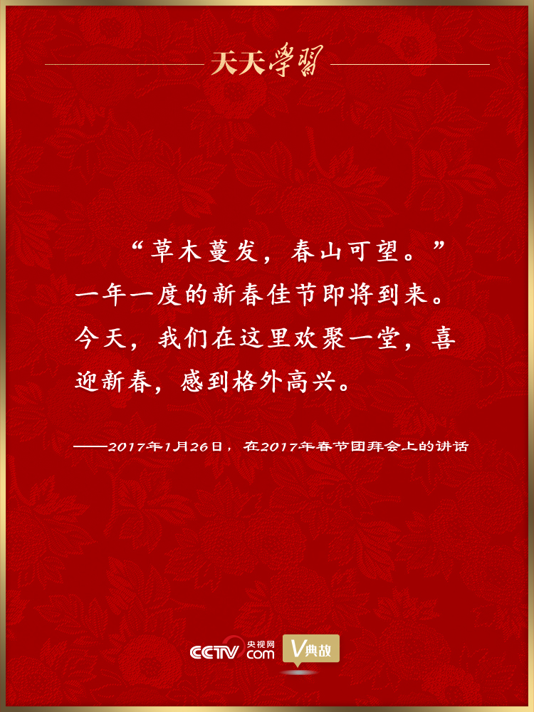 黨的十八大以來,習(xí)近平總書記多次在臘月二十九舉行的春節(jié)團(tuán)拜會上發(fā)表重要講話,盤點舊歲、謀劃新年,向全國各族人民、港澳臺同胞和海外僑胞拜年,并致以美好的新春祝福。在講話中,習(xí)近平總書記頻頻引用具有新春節(jié)令特點的古代經(jīng)典詩文名句抒發(fā)情懷、暢想未來。這些詩文名句如春風(fēng)化雨潤人心田、暖人心扉,激勵著億萬人民在新的一年里追夢前行。