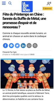 法國《北方之聲》網(wǎng)站刊發(fā)特稿《中國春節(jié):牛年將帶來希望與新生》稱,2021年春節(jié)聯(lián)歡晚會的總導演讓十幾億人暫時忘記了過去一年疫情帶來的陰霾。四個小時如夢如幻的晚會帶給人們太多感動,晚會多次致敬了那些與病毒戰(zhàn)斗的醫(yī)護人員,溫暖人心。