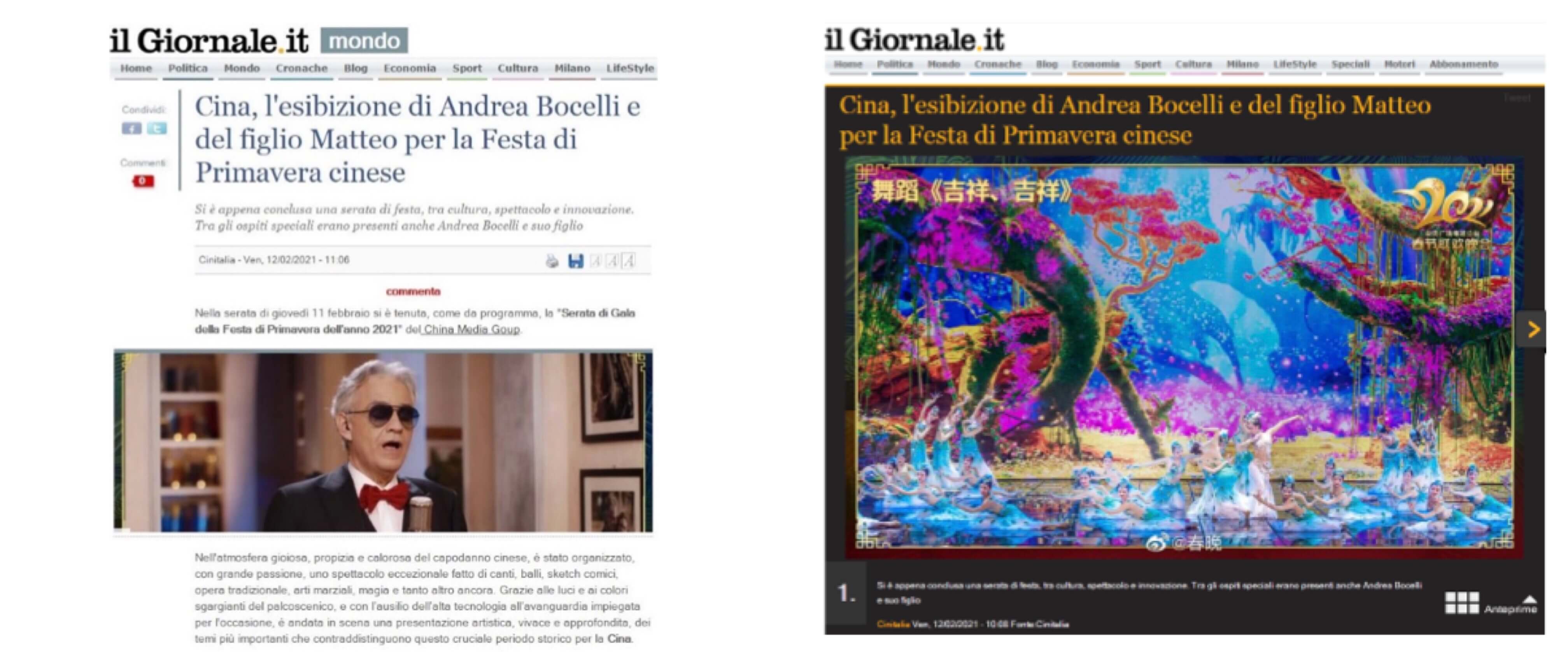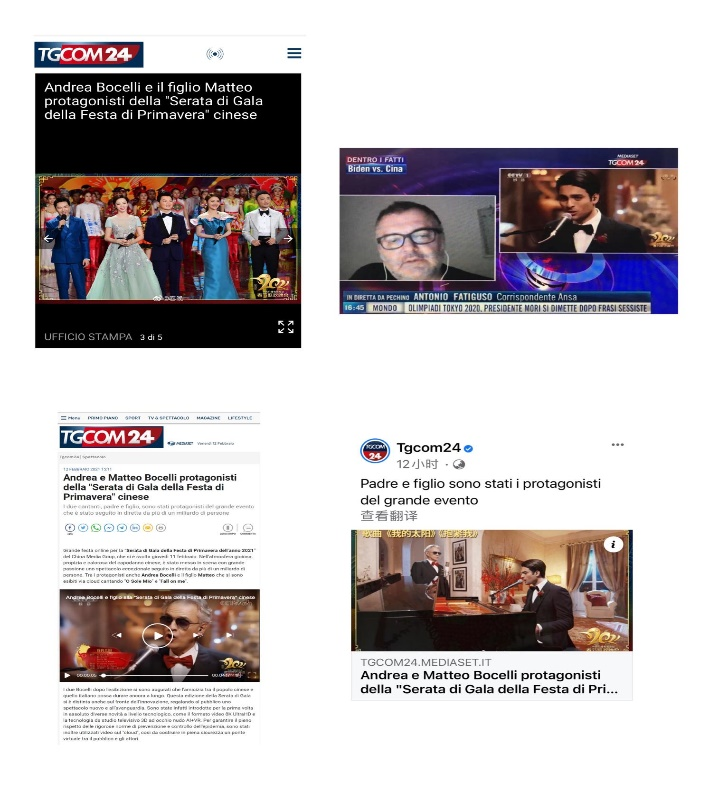 意大利重要的全國性報紙之一《日報》在網(wǎng)站發(fā)表題為《波切利父子春晚獻唱賀新春》的文章。文章寫道,中央廣播電視總臺春節(jié)聯(lián)歡晚會以歌舞、小品等形式,將建黨百年、疫情防控等主題生動呈現(xiàn)。意大利歌唱家波切利父子在晚會中演唱《我的太陽》等歌曲。意大利網(wǎng)友在社交媒體紛紛留言,表示愿中意兩國人民友誼長存。意大利最大的電視臺及新聞網(wǎng)站Tgcom24、意大利Teleambiente電視臺在晚間資訊欄目、意大利全國性通訊社Primapress分別發(fā)表了相關(guān)報道。