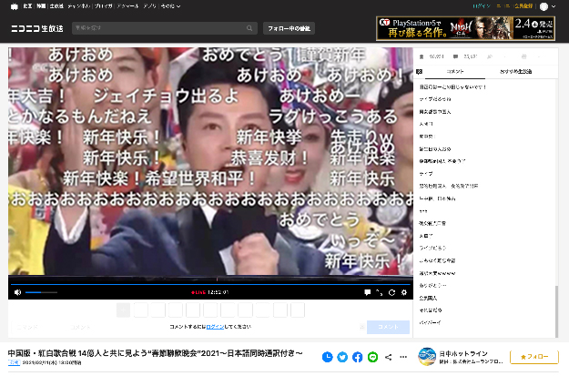 日本最大的視頻網(wǎng)站Niconico用日語同聲傳譯的方式,連續(xù)第六年對總臺春晚進行全程直播,引發(fā)日本民眾的廣泛關(guān)注和熱烈反響,實時在線觀看人數(shù)9.74萬人,彈幕評論數(shù)超過2.6萬條,節(jié)目好評率達91.7%。日本網(wǎng)友發(fā)彈幕評論稱“新年快樂”“中日友好”“舞臺設(shè)計很棒”“中國的技術(shù)現(xiàn)在已經(jīng)遠遠超過日本”等。