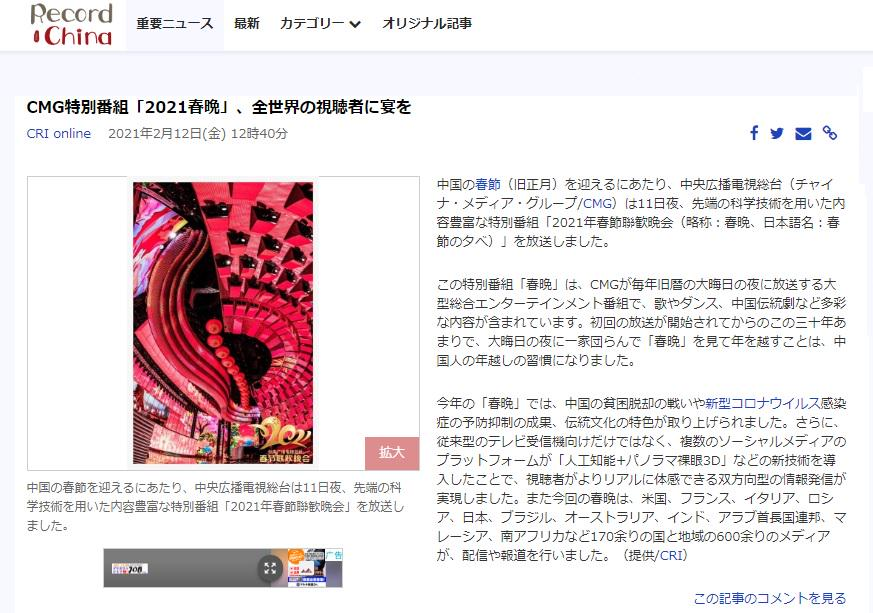 日本最大的中國資訊網(wǎng)站Record China發(fā)布報道稱,今年的春晚聚焦中國脫貧攻堅的成就、新冠疫情防控的戰(zhàn)略性成果等,緊扣時代主題,同時充分展示了中國的傳統(tǒng)文化。此外,新技術(shù)的應用也為觀眾們打造了一場令人震撼的視聽盛宴。