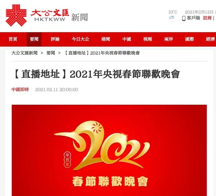 香港電視廣播有限公司(TVB)全程直播了春晚,大公文匯、《香港商報》、橙新聞也在新媒體平臺上進行網(wǎng)絡在線直播或摘播,吸引大量觀眾實時收看,并引起強烈反響。澳門廣播電視公司及旗下新媒體平臺澳廣視網(wǎng)站對春晚進行了轉(zhuǎn)播。