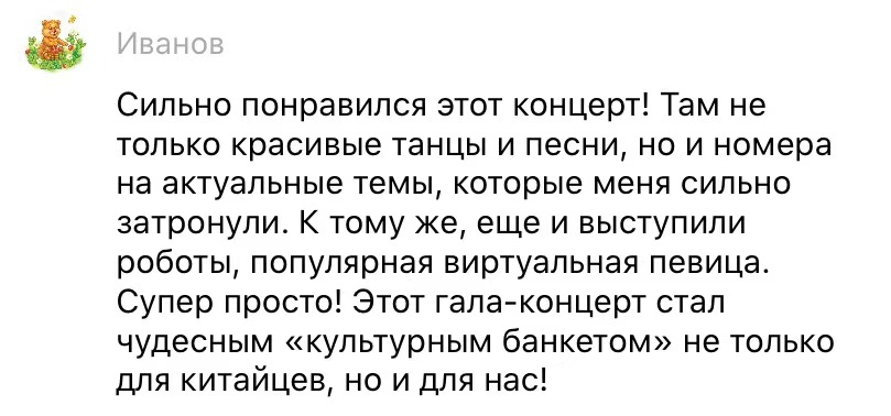 VK網(wǎng)友伊萬諾夫留言:“太喜歡這場晚會了!這里不僅能看到精彩的歌舞,而且還有很多反映時代主題的節(jié)目,令我深受感動。機器人和虛擬歌手的表演科技感十足,特別贊!這場晚會無論對于中國人,還是對于我們來說,都是一場美妙精彩的文化盛宴!”