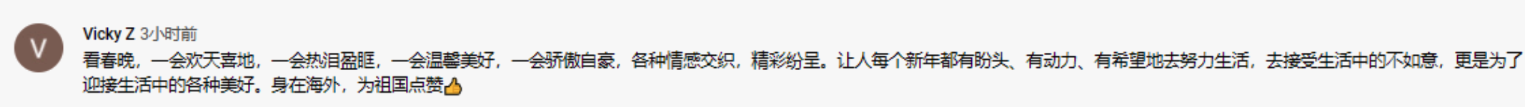 海外網(wǎng)友Vicky Z留言:“看春晚,一會歡天喜地,一會熱淚盈眶,一會溫馨美好,一會驕傲自豪,各種情感交織,精彩紛呈。讓人每個新年都有盼頭、有動力、有希望地去努力生活,去接受生活中的不如意,更是為了迎接生活中的各種美好。身在海外,為祖國點贊!
