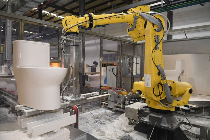 1月13日,智能機(jī)器人在福建省首家5G智慧陶瓷工廠生產(chǎn)潔具。新華社記者 宋為偉 攝