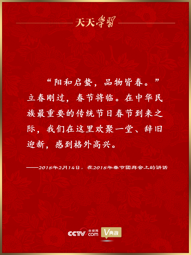 黨的十八大以來,習(xí)近平總書記多次在臘月二十九舉行的春節(jié)團(tuán)拜會(huì)上發(fā)表重要講話,盤點(diǎn)舊歲、謀劃新年,向全國各族人民、港澳臺同胞和海外僑胞拜年,并致以美好的新春祝福。在講話中,習(xí)近平總書記頻頻引用具有新春節(jié)令特點(diǎn)的古代經(jīng)典詩文名句抒發(fā)情懷、暢想未來。這些詩文名句如春風(fēng)化雨潤人心田、暖人心扉,激勵(lì)著億萬人民在新的一年里追夢前行。