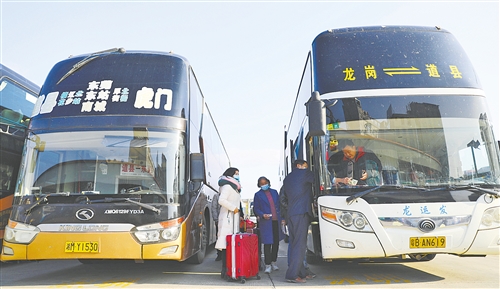 2月17日,湖南省永州市道縣汽車北站,旅客準(zhǔn)備上車。當(dāng)日,永州市迎來(lái)務(wù)工返程小高峰。該縣各車站“保運(yùn)”“防控”兩手抓、兩不誤,為返程人員提供交通運(yùn)輸保障。 何紅福攝