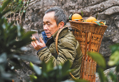 毛相林在背運(yùn)臍橙途中與水果商進(jìn)行電話溝通。