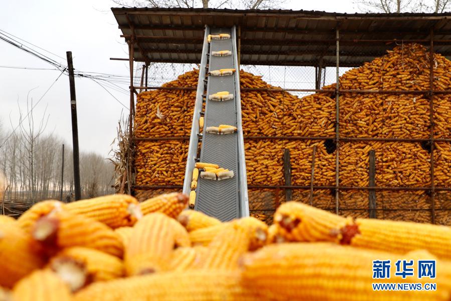 在哈爾濱市巴彥港鎮(zhèn)五星村農(nóng)民程顯義家院內(nèi),玉米通過(guò)傳送帶進(jìn)入玉米架子(2020年11月3日攝)。新華社記者 徐凱鑫 攝
