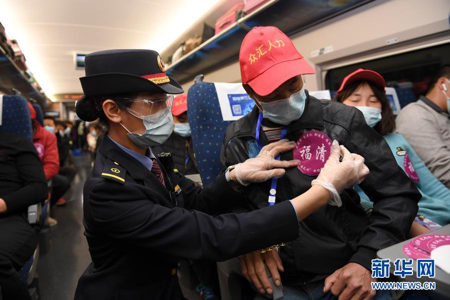 2月21日,在蘭州西開往福州的G1901次列車上,乘務(wù)員為務(wù)工人員貼上接站標(biāo)識牌。