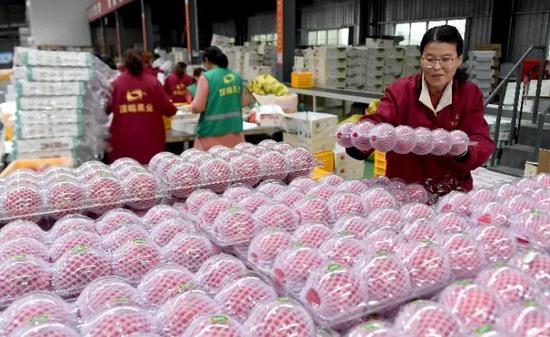 ↑陜西延安洛川縣頂端果業(yè)科技有限公司的工作人員在包裝蘋果(2019年4月28日攝)。地處中國(guó)西北黃土高原上的“紅色圣地”陜西延安,正成為新崛起的世界“蘋果之都”:根據(jù)最新統(tǒng)計(jì)數(shù)據(jù),截至2020年底,延安蘋果種植面積已達(dá)400.2萬畝,成為中國(guó)種植蘋果面積最大的地市。