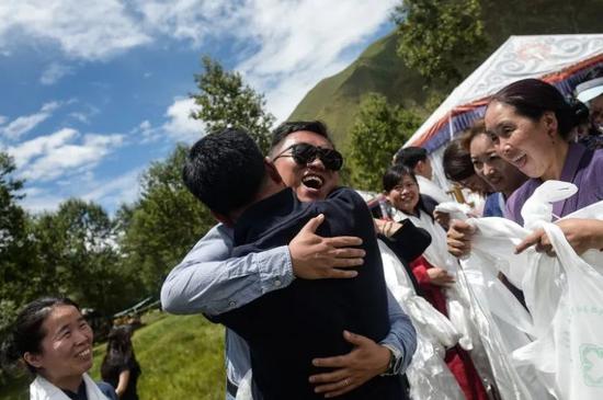 ↑在西藏拉薩市達(dá)孜區(qū),北京大學(xué)腫瘤醫(yī)院的援藏醫(yī)生袁燦(戴墨鏡者)與送別的藏族同事?lián)肀?2020年8月1日攝)。2015年以來,北京援藏醫(yī)療隊(duì)以“組團(tuán)式”醫(yī)療援藏為抓手,幫助拉薩市人民醫(yī)院新建了急診科、重癥醫(yī)學(xué)科等12個(gè)學(xué)科,推動(dòng)當(dāng)?shù)蒯t(yī)療事業(yè)發(fā)生格局性變化。如今,“組團(tuán)式”醫(yī)療援助已經(jīng)成為北京在助力脫貧攻堅(jiān)戰(zhàn)中一張閃亮的名片。