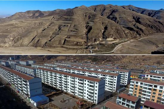 ↑上圖:已被拆除復(fù)墾的山西省岢嵐縣趙家洼村(2018年2月12日攝);下圖:岢嵐縣廣惠園新村一角(無人機(jī)照片,2018年2月13日攝)。趙家洼村曾是呂梁山集中連片特困地區(qū)的深度貧困村,村里只有900畝貧瘠的坡上旱地,生存條件十分惡劣。2017年,趙家洼村易地搬遷全部完成。位于岢嵐縣城的廣惠園移民新區(qū),成為村民們的新家。這里學(xué)校、幼兒園、醫(yī)院、休閑小廣場(chǎng)應(yīng)有盡有,百姓們的日子越過越敞亮。