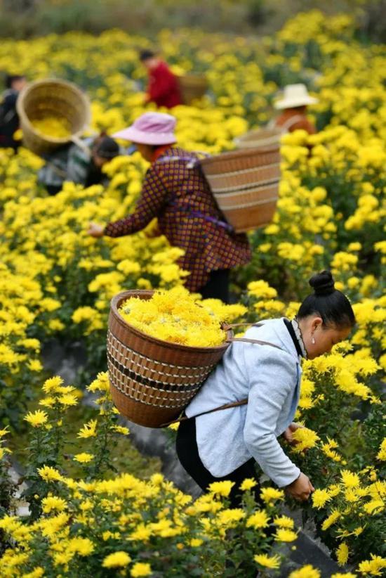 ↑2020年10月29日,湖北省恩施土家族苗族自治州宣恩縣曉關(guān)侗族鄉(xiāng)黃草壩村農(nóng)民在采摘金絲皇菊。在當(dāng)?shù)囟弊迦罕娋劬訁^(qū),農(nóng)民們?cè)隈v村扶貧工作隊(duì)的引導(dǎo)下積極種植金絲皇菊!昂献魃+基地+農(nóng)戶”的種植模式提高了農(nóng)民抵御市場(chǎng)風(fēng)險(xiǎn)的能力,激發(fā)了農(nóng)民耕作土地的積極性,促進(jìn)深山侗族群眾脫貧增收。