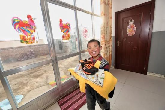 ↑在青海海東市互助縣五十鎮(zhèn)班彥新村,剛剛遷入新居的兒童手捧新買的衣服(2017年1月27日攝)。班彥新村129戶村民原來居住在海拔2800米的山上。脫貧攻堅(jiān)精準(zhǔn)識(shí)別時(shí),這個(gè)村貧困發(fā)生率高達(dá)57%。2016年,受益于易地扶貧搬遷政策,村民們整體搬遷到山下統(tǒng)一規(guī)劃、統(tǒng)一建設(shè)的新村。新村水、電、天然氣等一應(yīng)俱全;農(nóng)家樂、扶貧車間等政策的落實(shí),也讓移民們的生活有了保障。