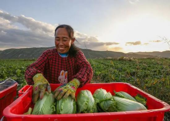 ↑2020年9月7日,農(nóng)民在寧夏回族自治區(qū)西吉縣硝河鄉(xiāng)高原村紅祥蔬菜種植專業(yè)合作社蔬菜種植基地收獲白菜。2020年11月,寧夏回族自治區(qū)政府正式批復(fù)同意西吉縣退出貧困縣序列。至此寧夏全區(qū)9個(gè)貧困縣(區(qū))全部實(shí)現(xiàn)脫貧摘帽。